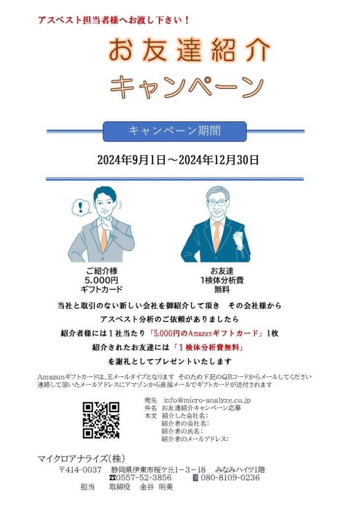 協力会社や同業他社など、アスベスト分析を委託している会社様をご存知の方へのキャンペーンです。